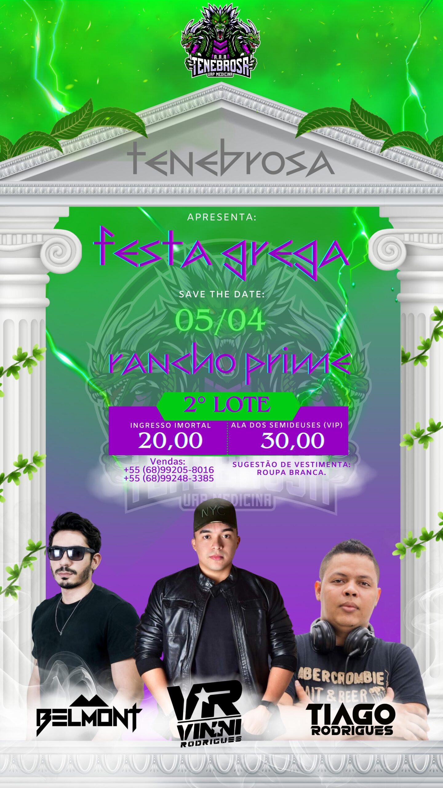 A Atlética Tenebrosa, conhecida por suas festas grandiosas e inesquecíveis, está de volta com mais um evento épico! No dia 05 de abril, o Rancho Prime, em Epitaciolândia, será transformado em um verdadeiro cenário mitológico para receber a tão esperada Festa Grega.