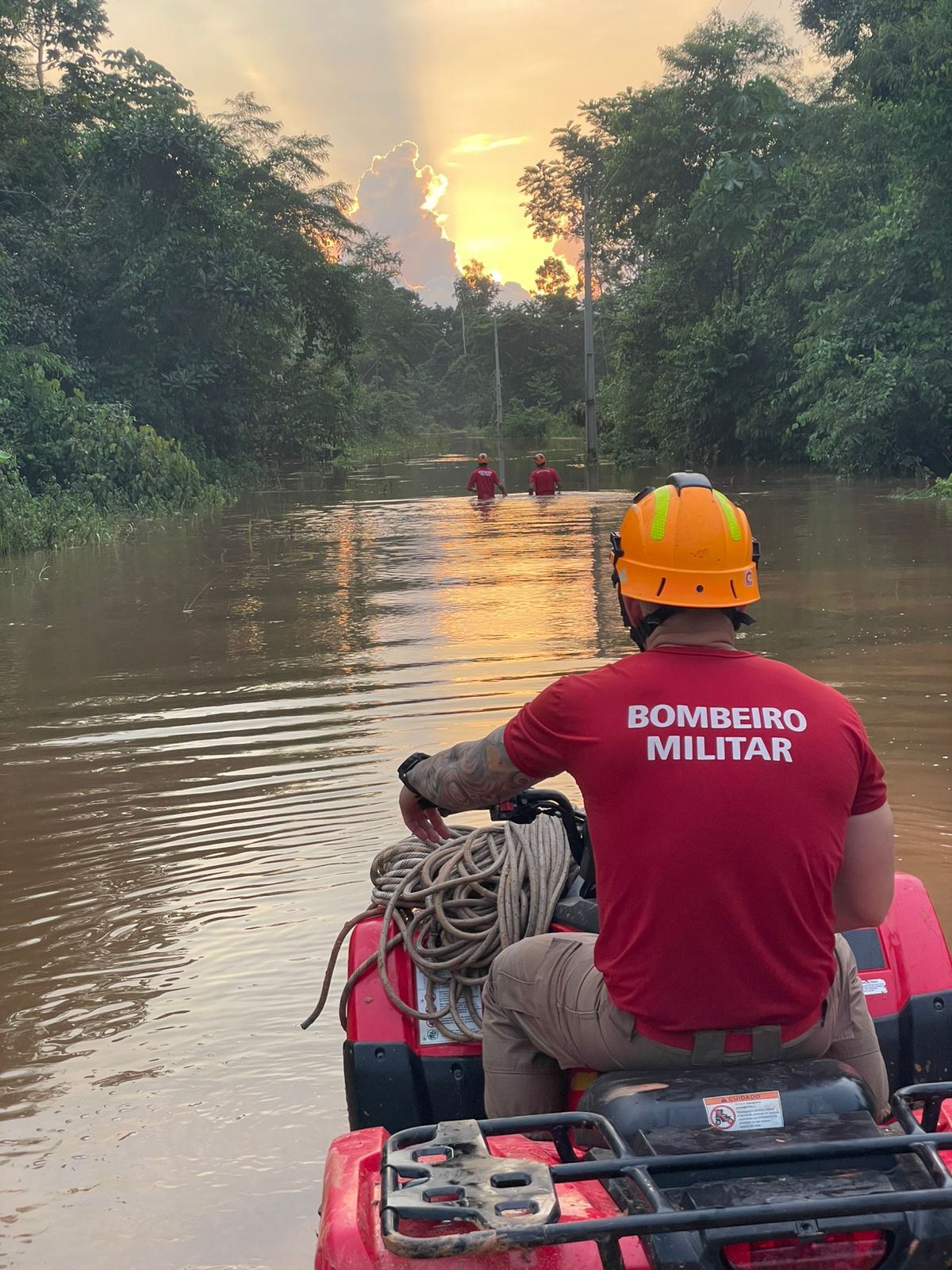 O CBMAC foi a primeira resposta. Em quadriciclo, a pé e com tentativa de progressão por motonáutica, os bombeiros avançaram onde era possível, superando lama, água e longos deslocamentos. Diante da inviabilidade do resgate terrestre, que poderia durar toda a noite e expor a gestante a riscos adicionais, a equipe realizou a estabilização inicial da paciente, com apoio técnico do Samu, incluindo medicação e acompanhamento profissional.