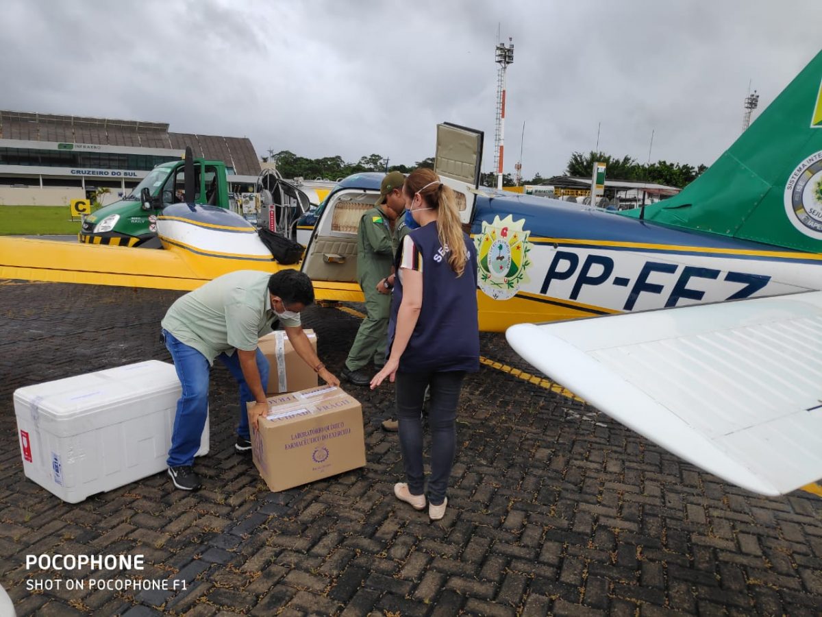 Considerando a atual situação em que o vírus já chegou, acerca de um mês na região do Juruá, essa entrega está sendo feita agora a cada 15 dias, chegando inclusive nas unidades mais distantes, por meio da parceria com a Secretaria de Justiça e Segurança Pública (Sejusp) e do Centro Integrado de Operações Aéreas (Ciopaer) que está utilizando o Harpia 2, que é o avião do governo do Estado para transportar esses insumos.