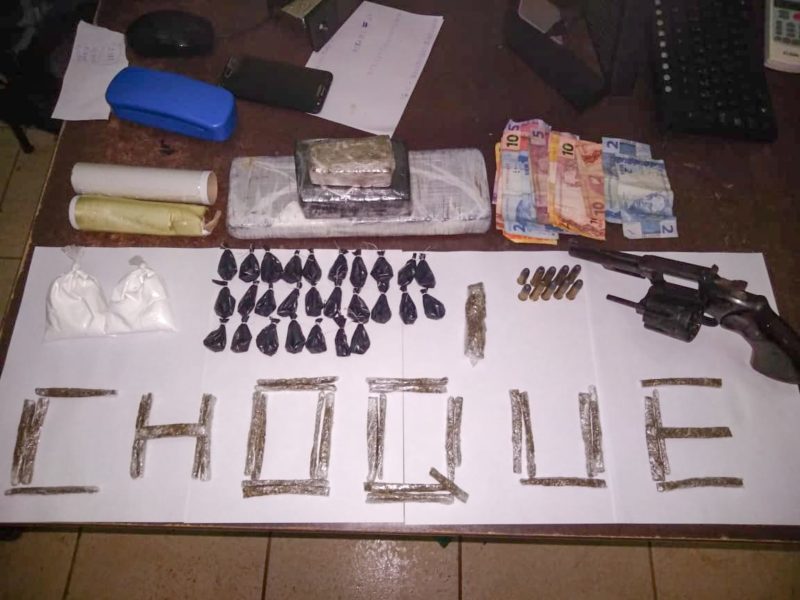 Segundo os militares, eles chegaram ao endereço após uma denúncia anônima, informando que no local haviam drogas e armas de fogo. Foram apreendidos 1,5 kg de maconha, 130 gramas de cocaína, um revólver calibre .38 e 10 munições intactas. Parte do entorpecente estava enterrado no terreno da casa do preso.