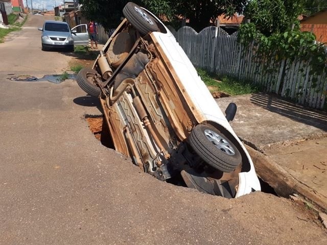 Imagens enviadas ao ac24horas mostram um veículo de modelo Gol, que foi engolido por um buraco na rua Buriti, no bairro Calafate. O acidente ocorreu na tarde desta quarta-feira, 30. O buraco chega alcançar quase a metade da rua.