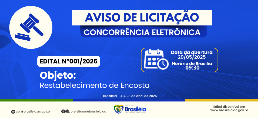 Concorrência Eletrônica N°001/2025 – Aviso de Licitação Source link Compartilhe isso: Clique para compartilhar no Facebook(abre em nova janela) Facebook Clique para compartilhar no X(abre em nova janela) 18+ Clique para compartilhar no WhatsApp(abre em nova janela) WhatsApp Curtir isso:Curtir Carregando... Navegação de Post Inédito: Com melhor ataque e defesa Brasileia é Campeã do desafio Internacional de Futsal Masculino na fronteira Prefeito Carlinhos do Pelado comemora 100 dias de gestão com muito trabalho realizado e equipe envolvida para que Brasiléia avance cada dia mais