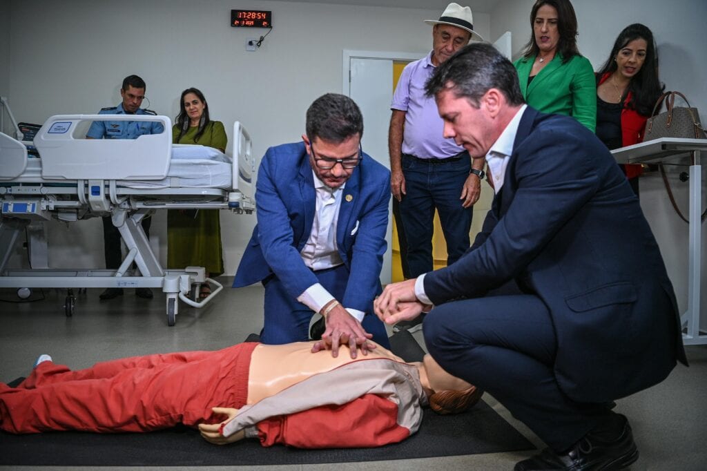 Durante o evento, o governador participou de uma demonstração de massagem cardíaca, destacando a importância da capacitação em primeiros socorros. Ele parabenizou os idealizadores da clínica, os irmãos Carlos e Odilson Silvestre, naturais de Brasileia, que investiram mais de R$ 20 milhões no empreendimento.