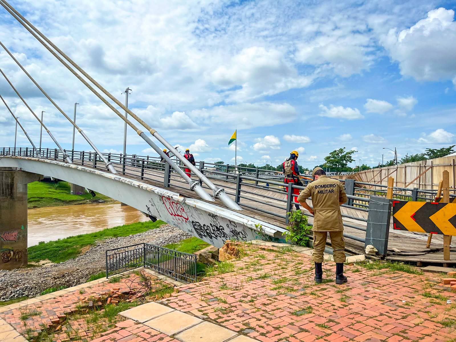 A presidente do Deracre, Sula Ximenes, destacou que “a equipe do Corpo de Bombeiros atua na instalação dos cabos de aço, que serão ancorados às máquinas estrategicamente posicionadas ao lado da passarela, funcionando como suporte para o pilar principal da estrutura”.