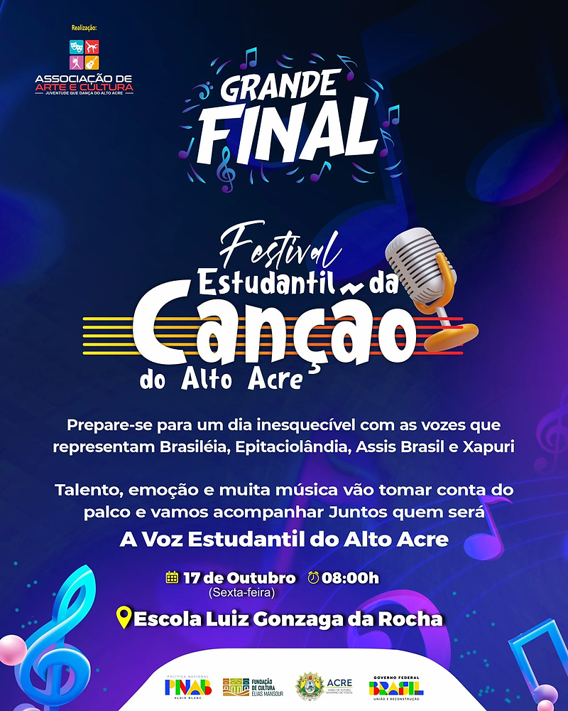 Na Escola Luiz Gonzaga da Rocha, em Epitaciolândia, nesta sexta-feira (17), acontece a Grande Final do I Festival Estudantil da Canção do Alto Acre, evento que celebra o talento e a criatividade dos estudantes das escolas públicas de Brasiléia, Epitaciolândia, Xapuri e Assis Brasil. Realizado pela Associação de Arte e Cultura do Alto Acre, com produção de Enage Peres Produções e Eventos, o festival é um marco para a cultura regional e promete novas edições nos próximos anos. A Escola Luiz…