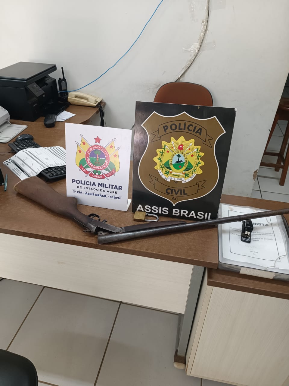 Durante a revista nas redondezas do imóvel, uma espingarda de fabricação caseira foi encontrada em um terreno que fica ao lado da casa do suspeito.