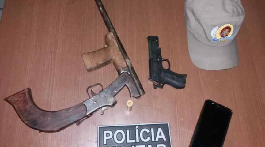 Na aproximação da viatura, os dois começaram a correr e entraram da residência da mãe da adolescente. A polícia ainda conseguiu fazer a abordagem, e em uma bolsa foi encontrada uma escopeta calibre 36 com uma munição intacta e um simulacro.