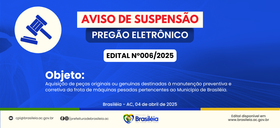 PE N°006/2025 – Aviso de suspensão de Licitação Source link Compartilhe isso: Clique para compartilhar no Facebook(abre em nova janela) Facebook Clique para compartilhar no X(abre em nova janela) 18+ Clique para compartilhar no WhatsApp(abre em nova janela) WhatsApp Curtir isso:Curtir Carregando... Navegação de Post No aniversário do prefeito Carlinhos do Pelado, deputado Eduardo Velloso presenteia Brasileia com mais de R$ 2 milhões para a saúde e obras no município Inédito: Com melhor ataque e defesa Brasileia é Campeã do desafio Internacional de Futsal Masculino na fronteira