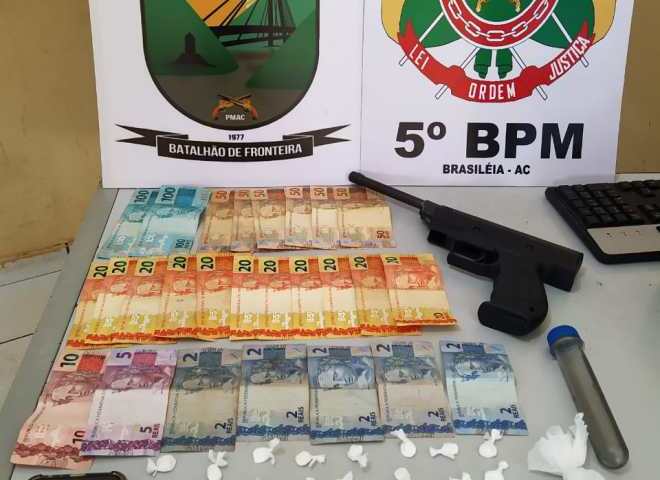 A arma seria uma pistola de pressão que foi adaptada para receber projétil calibre 22 e que foi apreendida. Ao revistarem a casa, encontraram dentro do fogão, um pacote contendo cerca de 30 papelotes com cocaína e encima de uma cômoda da casa, um tubo transparente com mais cinco papelotes com drogas. Também foi localizado dentro da gaveta, cerca de R$ 740 reais, o que seria do comercio ilegal de entorpecente.