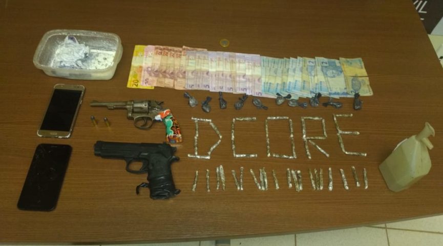 Durante uma revista na residência, a polícia aprendeu um revólver calibre 32 com duas munições e um simulacro, além de uma quantia em dinheiro de R$ 150,00 e 47 tabletes de maconha, 10 trouxinhas de cocaína e dois celulares .