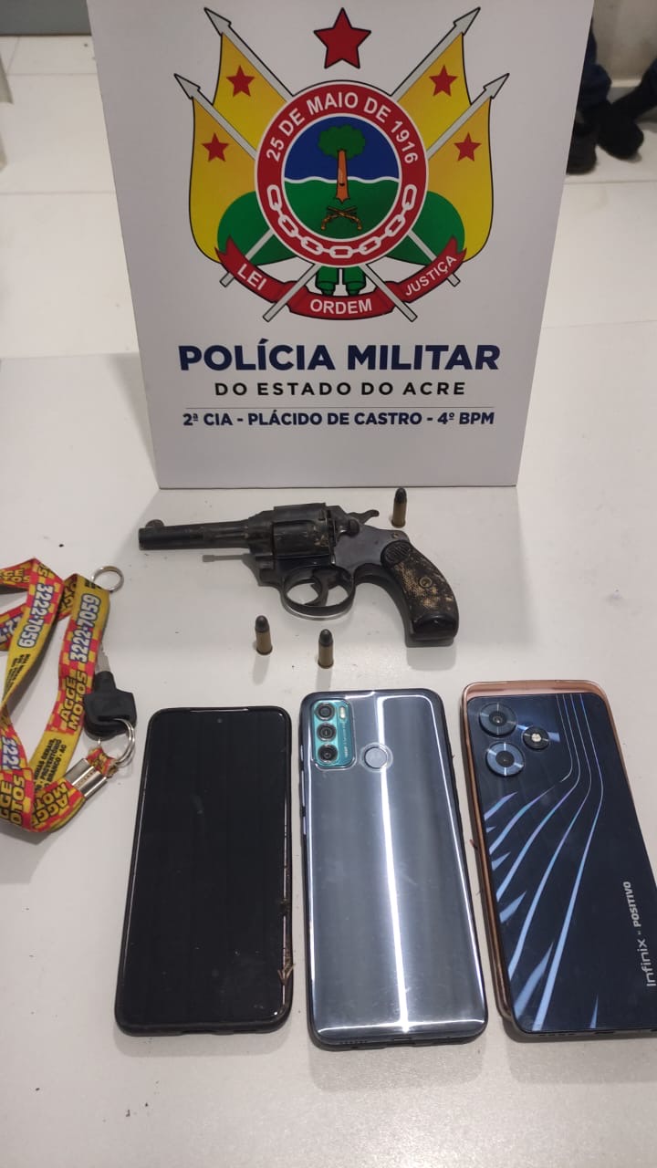 Policiais militares que atuam em Plácido de Castro capturaram um foragido da justiça, apreenderam uma arma de fogo e recuperaram um veículo, motocicleta Honda/Twister, na sexta-feira, 11, na zona rural do município.
