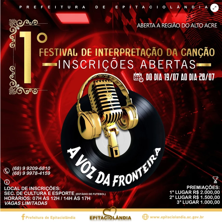 O Festival tem por objetivo a valorização dos músicos locais, pessoas que cantam em bares, aniversários, roda entre amigos, igreja etc. portanto não percam a chance de mostra seu talento. Inscreva-se, você pode se tornar a “Voz da Fronteira” e ser o grande vencedor do 1° Festival de Interpretação da Canção de Epitaciolândia.