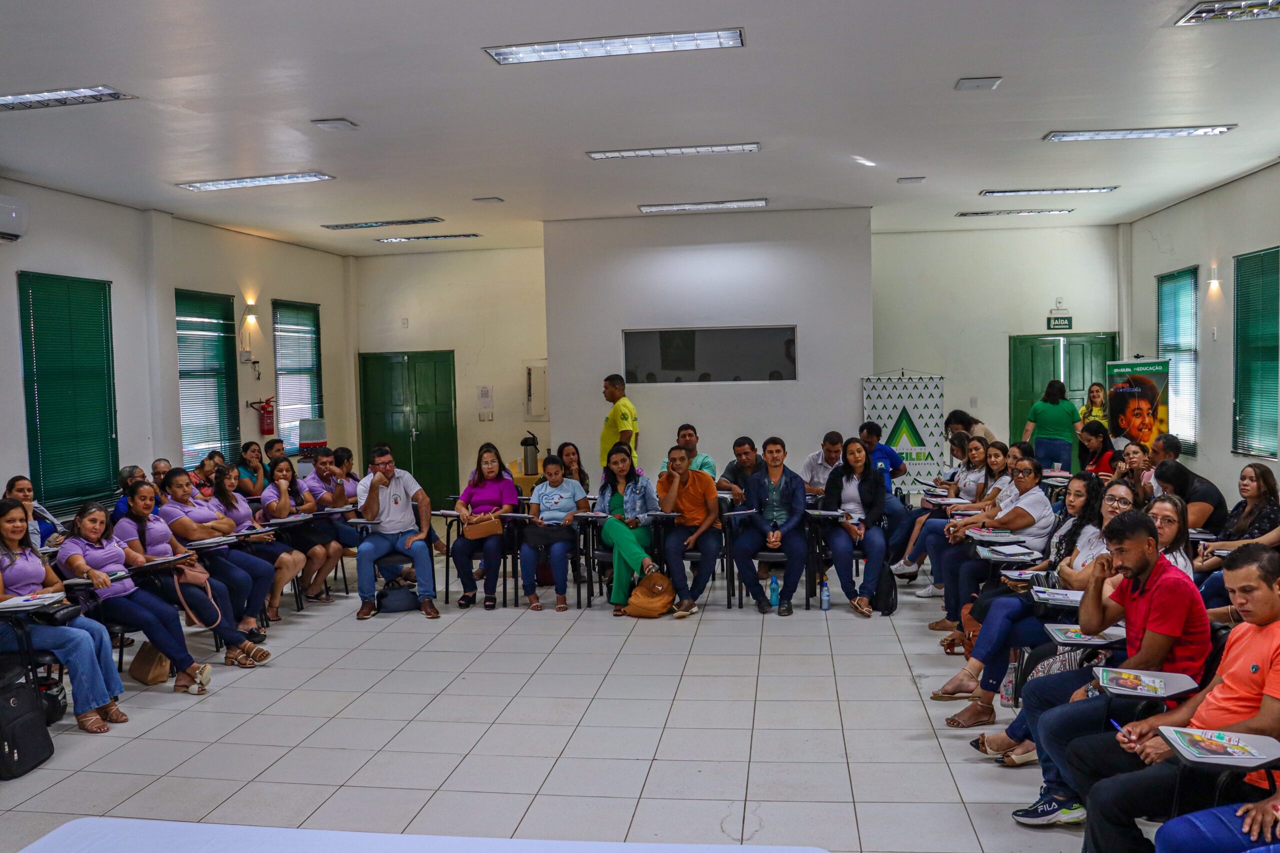 Mais de 100 docentes alfabetizadores, professores, gestores e coordenadores pedagógicos participaram da formação, que aconteceu no auditório Maria da Paz.