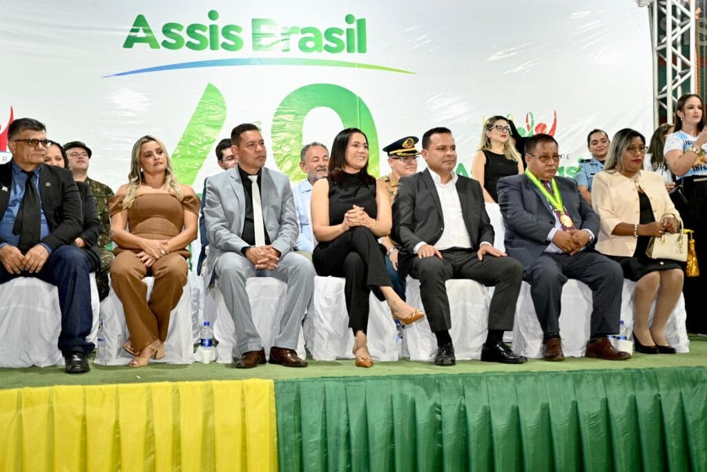 A vice-governadora e titular da Secretaria de Estado de Assistência Social e Direitos Humanos (SEASDH), Mailza Assis, participou na noite desta quarta-feira, 14, do ato cívico em comemoração aos 49 anos de emancipação política de Assis Brasil. A celebração foi realizada na região de tríplice fronteira, no Alto Acre, e reuniu autoridades municipais, estaduais e militares, além de lideranças comunitárias, estudantes e a população local.