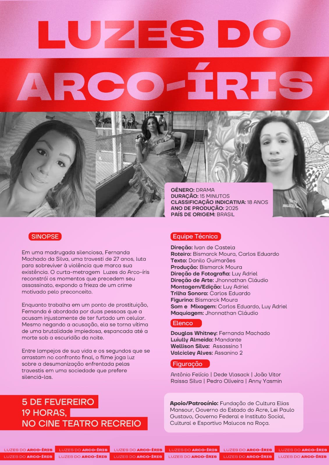 Por meio da lei de incentivo à cultura, Lei Paulo Gustavo (LPG), do governo do Acre, por intermédio da Fundação Elias Mansour (FEM) e produzido pelo Instituto Social, Cultural e Esportivo Malucos na Roça, estreia nesta quarta-feira, 5, às 19h, o curta-metragem Luzes do Arco-Íris, no Cine Teatro Recreio, em Rio Branco. Com entrada gratuita e classificação indicativa para maiores de 18 anos, o filme promete emocionar e provocar reflexões sobre a violência contra pessoas transexuais e travestis no Brasil.