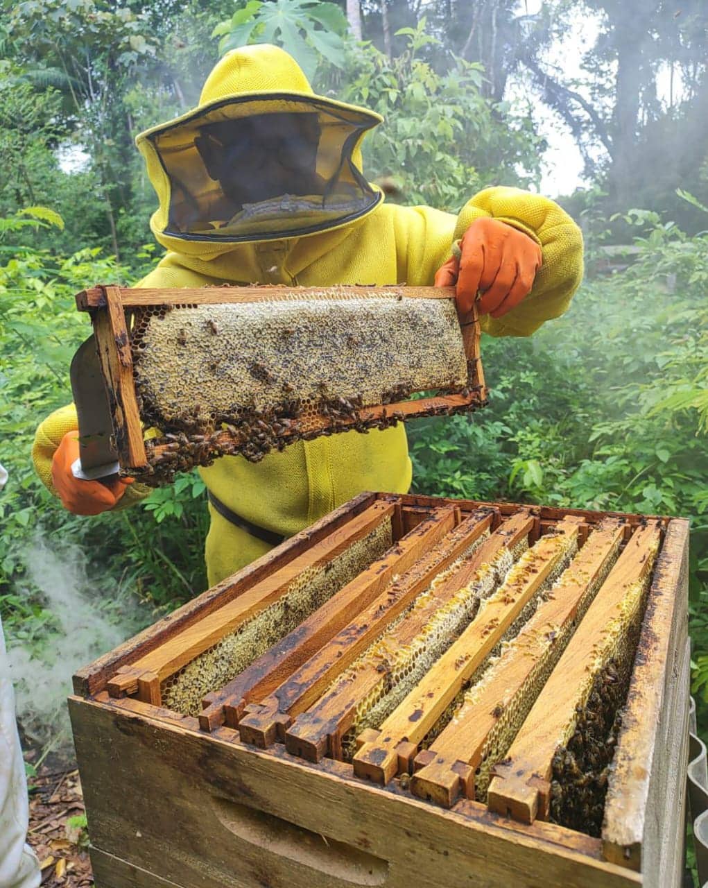 Zandra Pilar, engenheira florestal e responsável pela cadeia produtiva do mel na Seagri, destaca que a ação técnica é essencial no campo, para ajudar apicultores, voltados à criação de abelhas com ferrão, e meliponicultores, que se dedicam às abelhas sem ferrão.