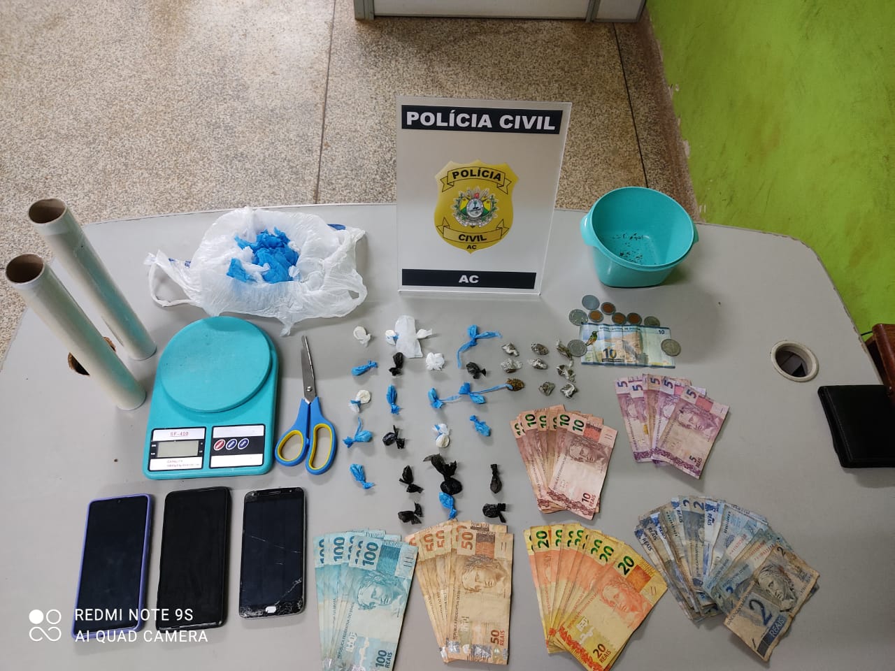 A Polícia Civil cumpriu quatro mandados de busca e apreensão e logrou êxito na prisão em flagrante e na apreensão de 23 trouxinhas de cocaína, 9 barras de maconha, R$ 1.821,00 (mil oitocentos e vinte e um reais) além de material para embalo da droga, balança de precisão e vários celulares.