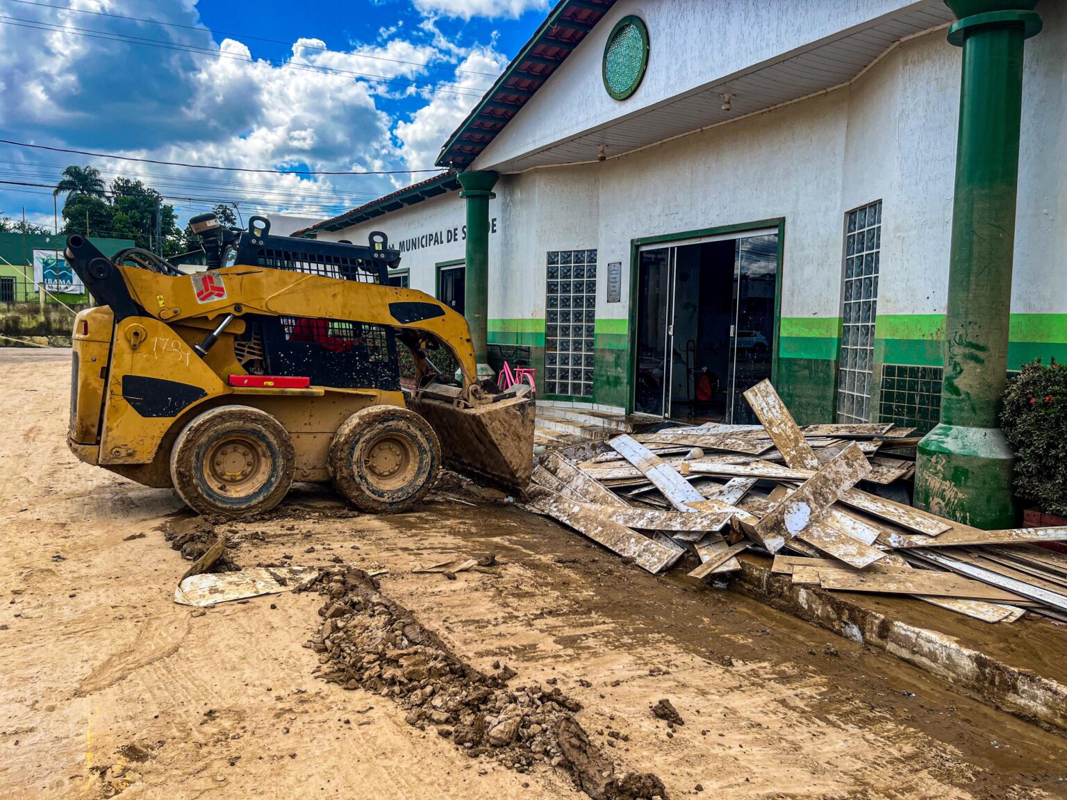 São realizados serviços de desobstrução ruas e bueiros garantindo nessa primeira fase acesso a casas e prédios públicos para limpeza no centro da cidade e nos bairros que sofreram com a maior alagação do Rio Acre no município.